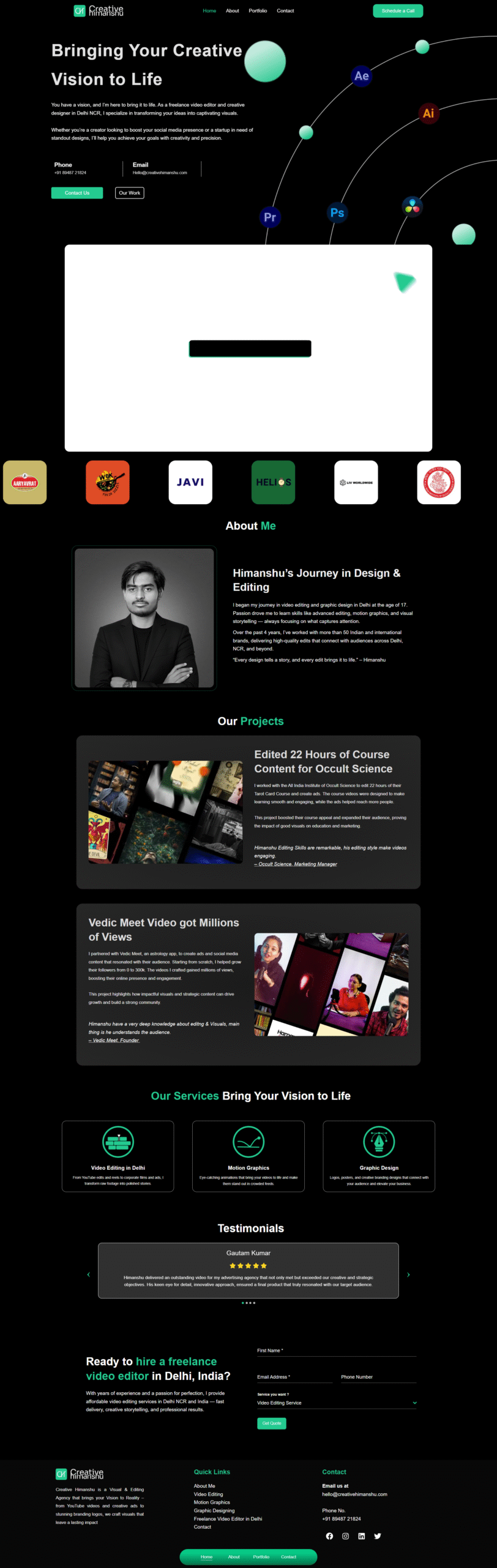 We designed a fully animated, interactive website for Creative Himanshu, focusing on a black & green theme to reflect his bold and modern style. The site showcases his portfolio, services, and lead generation functionality while ensuring fast loading, SEO optimization, and engaging user experience.