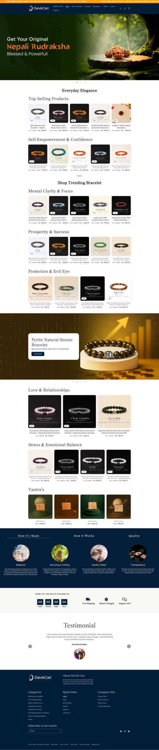 For Daivik Cart, a brand selling Rudraksha and astrological stones, I built a Shopify store designed to connect emotionally with spiritual customers. Using HTML, CSS & Liquid, I customized the layout to build trust and guide users toward purchase.
